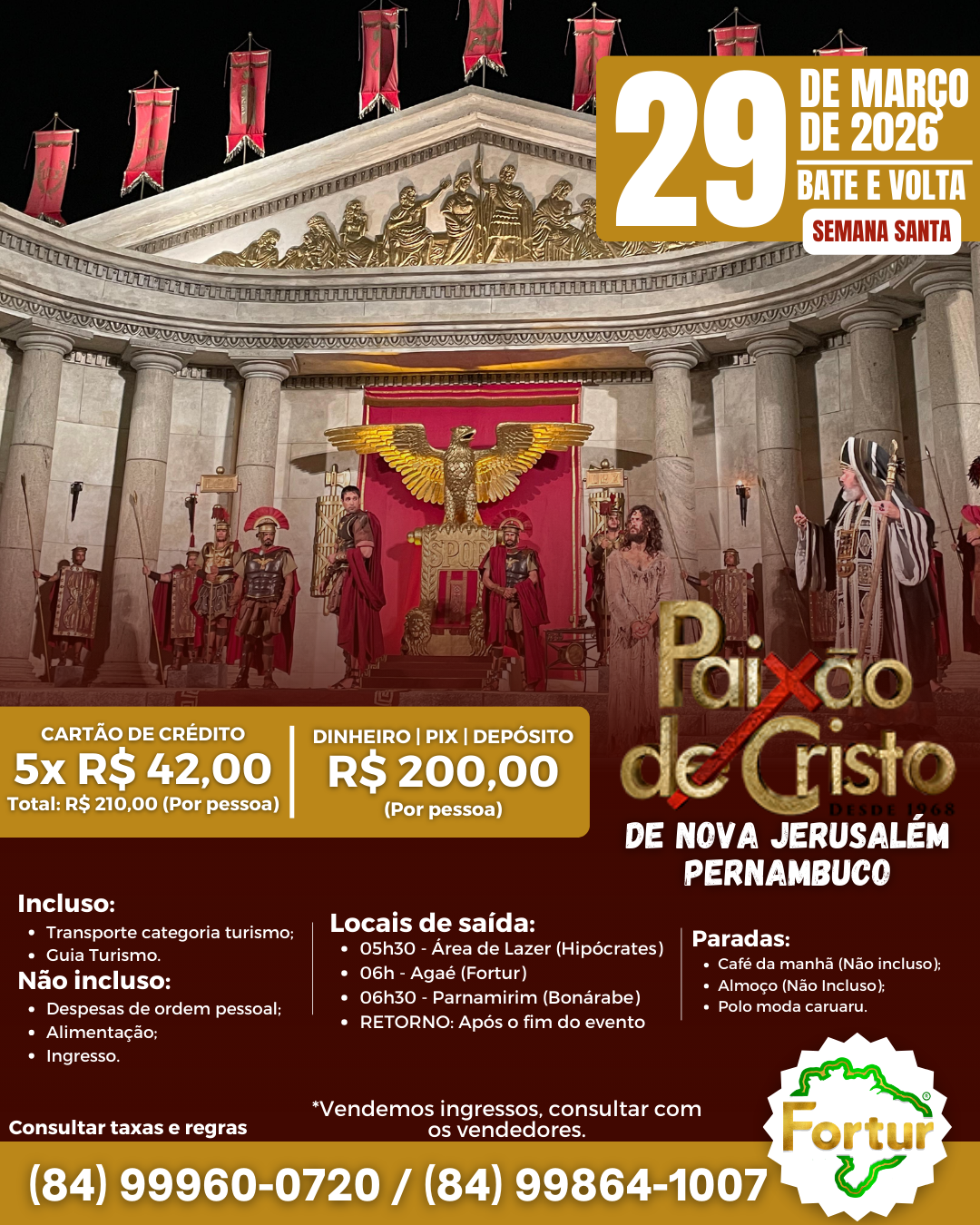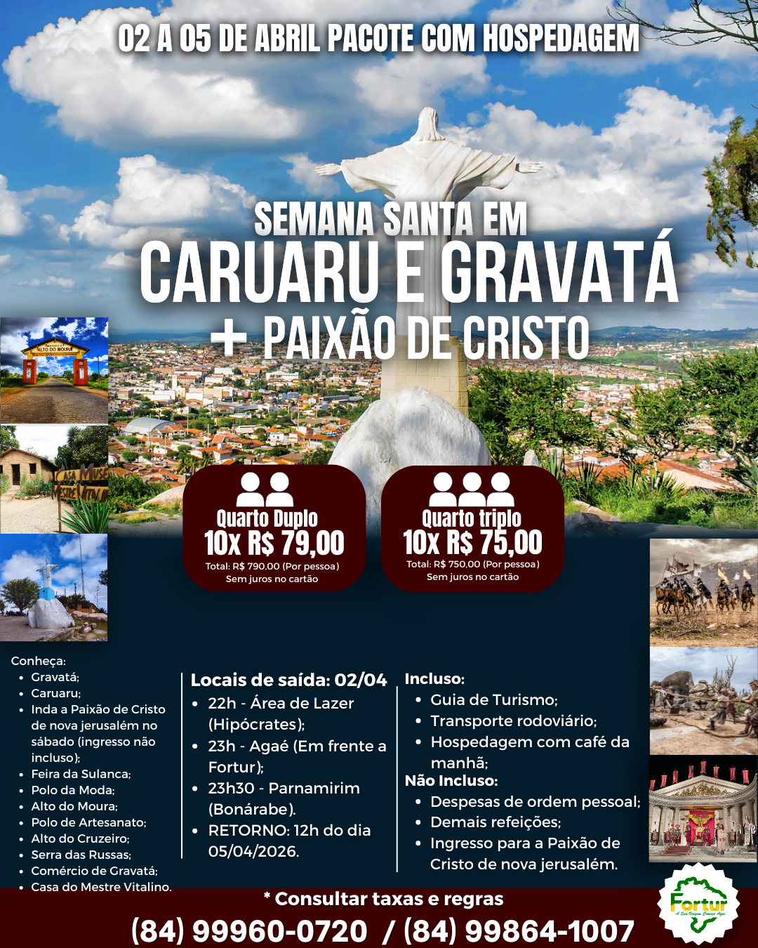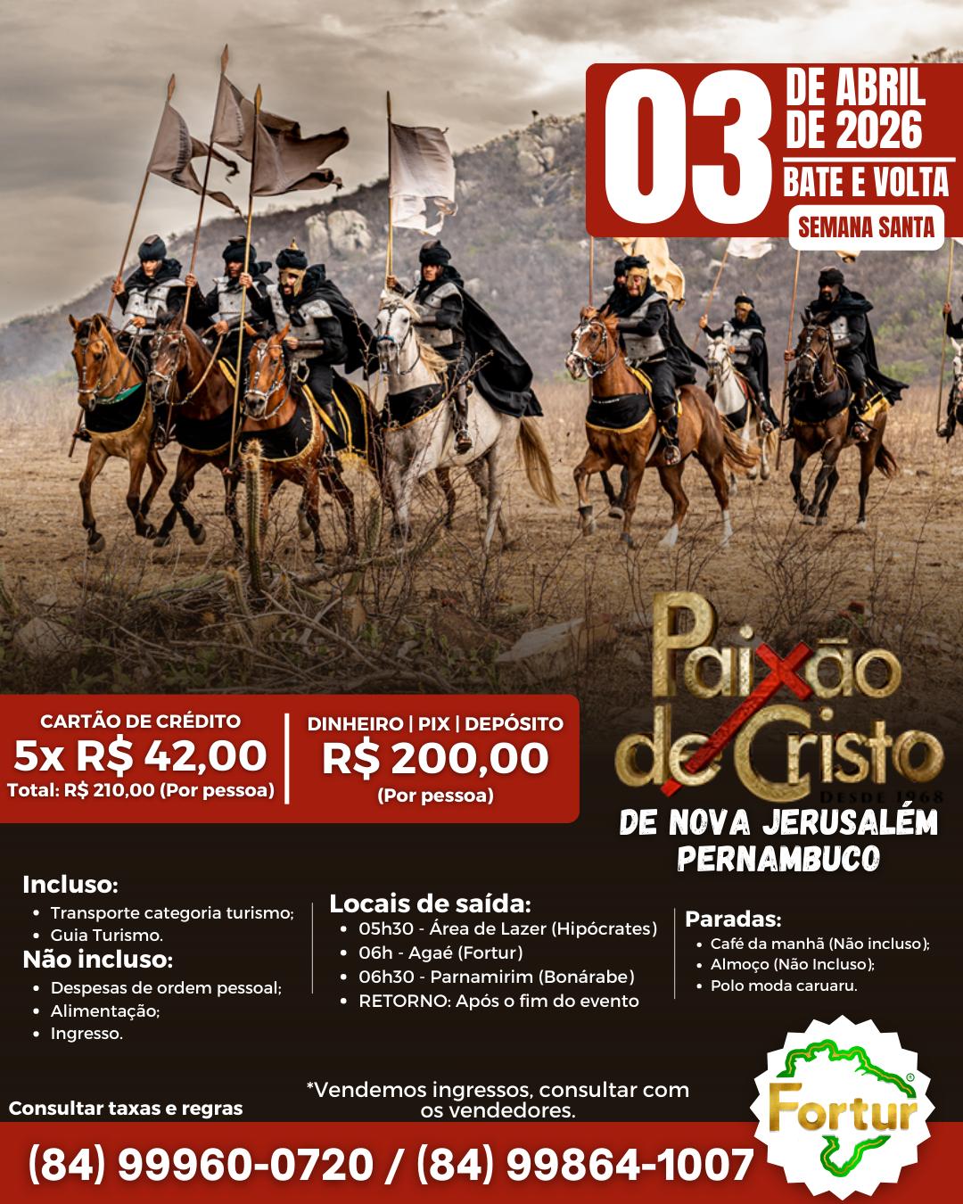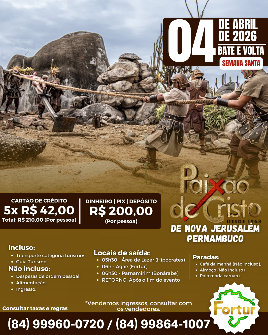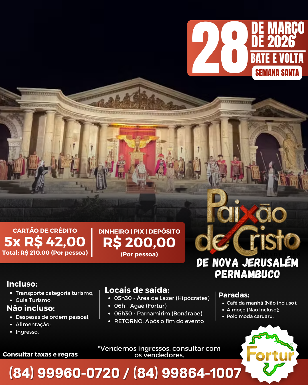 Este ano, a Fortur está com opções para te levar a Nova Jerusalém e viver esse momento histórico, com fortes emoções e uma experiência única de fé, cultura e espetáculo ao vivo no maior teatro ao ar livre do mundo.